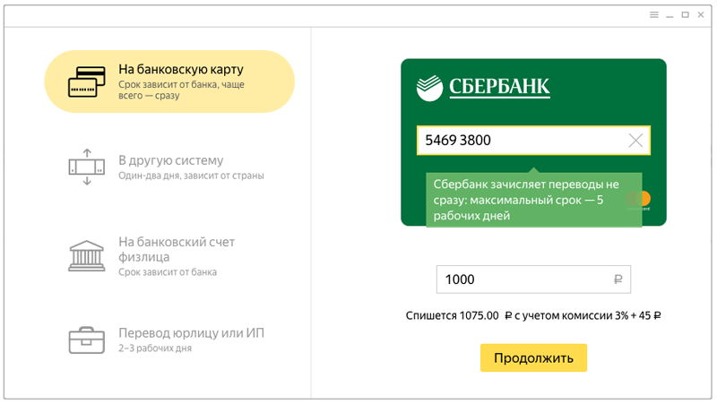 Комиссия за перевод из кошелька на карту — 3% + 45 ₽. Как правило, деньги приходят мгновенно, но на карту Сбербанка перевод может идти до 5 рабочих дней.
