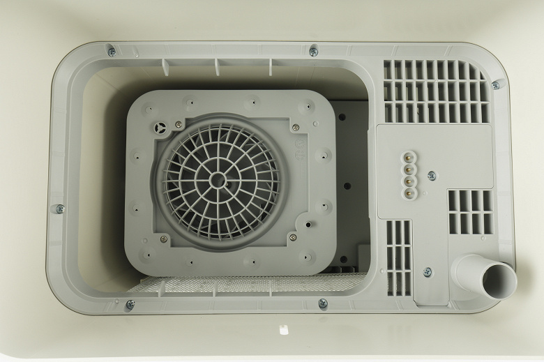 Внутри корпуса за пластиковой решеткой размещается цилиндрический вентилятор, приводящий воздух в движение.