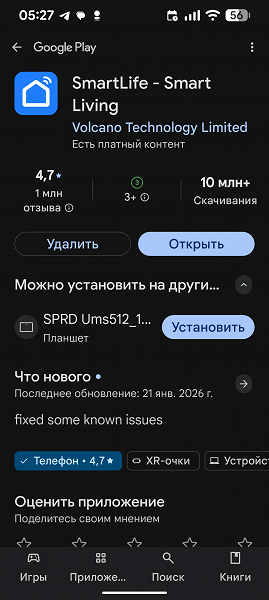 Это популярное приложение знакомо нам по предыдущим обзорам различной техники. На момент создания материала оно насчитывает более 10 миллионов скачиваний и обладает весьма неплохим рейтингом (4,7 из 5 возможных на основе более миллиона отзывов). Smart Life поддерживает сотни самых разных умных устройств, объединяя их в единую экосистему.
