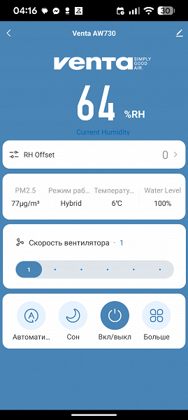 Еще ниже располагается слайдер скорости вентилятора, а под ним — кнопки режимов работы. Здесь можно активировать или отключить ночной и автоматический режимы, перевести устройство в спящий режим или разбудить его.