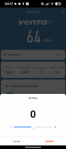 Удобное мобильное приложение позволяет управлять прибором из любой точки земного шара, но не слишком расширяет его возможности: мы не обнаружили в программе ни графиков состояния микроклимата, ни управления устройством по расписанию, ни возможности вовремя узнать о том, что в баке кончилась вода.