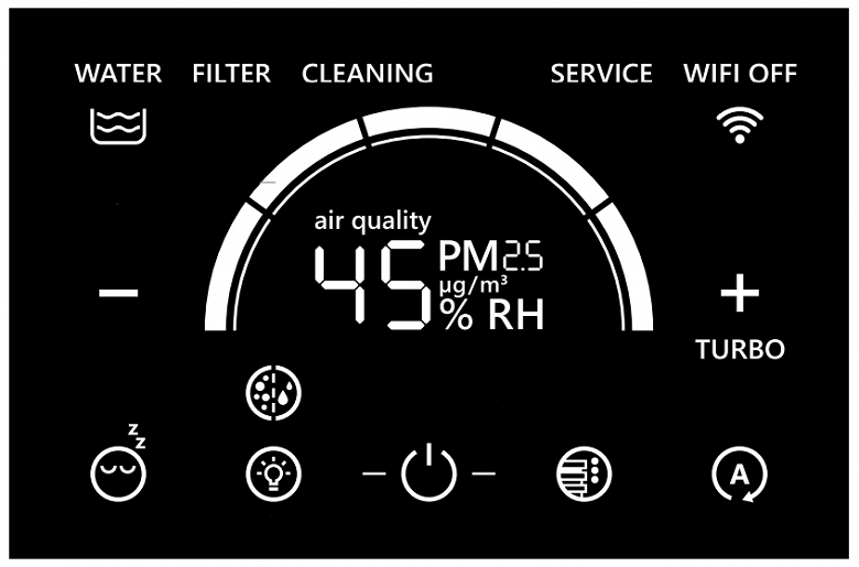 При включении в центре дисплея зажигается двухсимвольный цифровой дисплей, отображающий текущий уровень загрязнения воздуха взвешенными частицами PM2.5 в микрограммах на кубометр. Если плотность превышает 99 мкг/м³, вместо цифр появляются буквы «HI». Здесь же может отображаться значение относительной влажности в процентах.