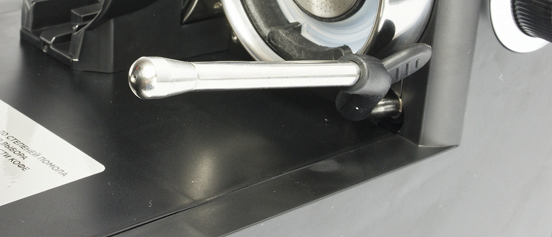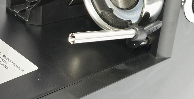Второй нюанс касается установки держателя фильтра. Ручка у него довольно длинная, а место установки находится в непосредственной близости от кофемолки. В результате вся конструкция получается несколько тесноватой. Рожок с молотым кофе приходится заводить в строго определенном положении, а небольшие отклонения могут помешать его правильной установке. Да и работа с капучинатором выглядит слегка тесной: трубка не отклонятся от корпуса, только поворачивается по своей оси. При этом высота от точки выхода пара до столешницы составляет 10,5 см, а до поддона для сбора капель — всего 6 см.