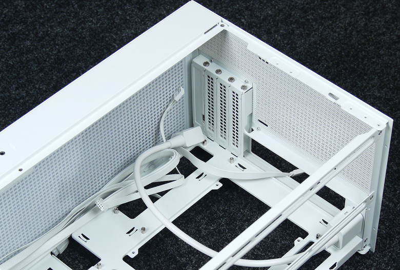 Для плат расширения предусмотрен единственный способ установки — непосредственно в слот системной платы. Подключение видеокарты через райзер здесь не предусмотрено, а для ее длины заявляется максимум в 413 мм в отсутствие вентиляторов на верхней панели или 388 мм при их наличии. По нашему замеру, расстояние от заглушек слотов расширения до верхней поверхности составляет 414 мм.