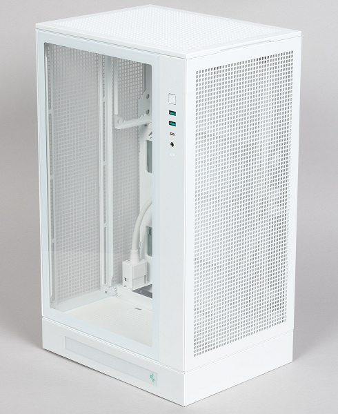 Корпус по форме — ярко выраженная «башня»: стороны его основания заметно меньше высоты, на столе такая конструкция будет занимать минимум места. Системная плата устанавливается вертикально, но с поворотом на 90° — разъемы получаются не сзади, а внизу. Поэтому в нижней части корпуса имеется пьедестал, в задней стенке которого предусмотрен большой проем для кабелей.