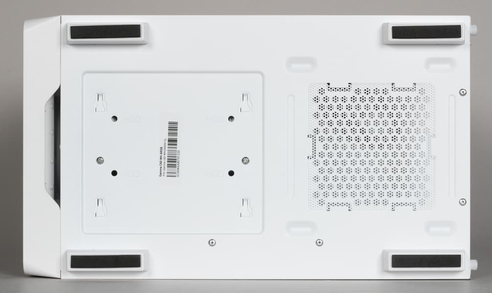 Внизу область с отверстиями совсем небольшая, рассчитанная лишь на вентилятор блока питания. Фильтр тоже есть, и тоже пластиковый, но более жесткий и без магнитов, он вставляется в штампованные Г-образные выступы с наружной стороны днища. Для снятия и возврата на место корпус придется класть на бок или сильно наклонять.