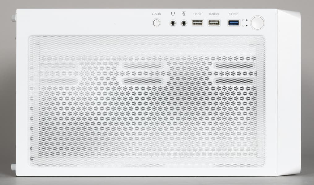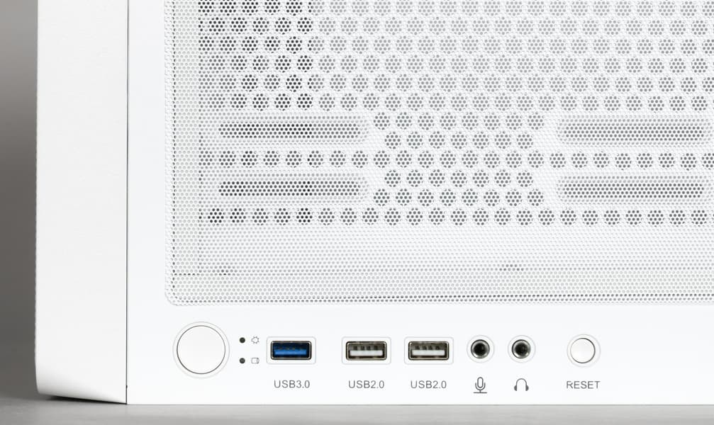 Интерфейсные разъемы и кнопки расположены в правой части верхней плоскости шасси. Ближе к передней части находится большая круглая кнопка Power, затем пара светодиодных индикаторов включения и дисковой активности, единственный порт USB 3.0, два порта USB 2.0, два 3,5-миллиметровых гнезда для наушников и микрофона, кнопка перезагрузки (тоже круглая, но поменьше). Разъем Type-C не предсмотрен.