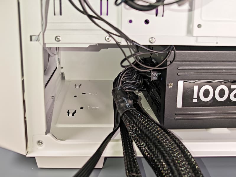 Блок питания вставляется с правой стороны горизонтально и должен ориентироваться вентилятором вниз. Фиксируется он на задней стенке корпуса при помощи четырех винтов, правильной установке помогают небольшие штампованные выступы-опоры, амортизирующие накладки на которых отсутствуют. Максимальная его длина в спецификации указана как 170 мм, наш замер показал расстояние в 190 мм до корзины для 3,5-дюймовых дисков, чего с учетом отходящих проводов для некоторых современных БП может оказаться недостаточно — в таком случае придется удалить дисковую корзину, что позволит увеличить пространство до 332 мм (если спереди не установлен радиатор СЖО).