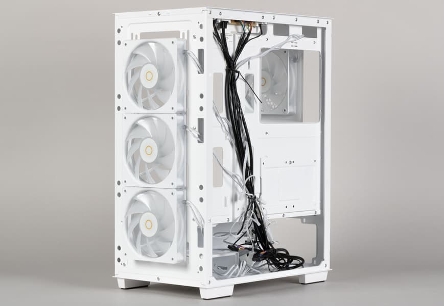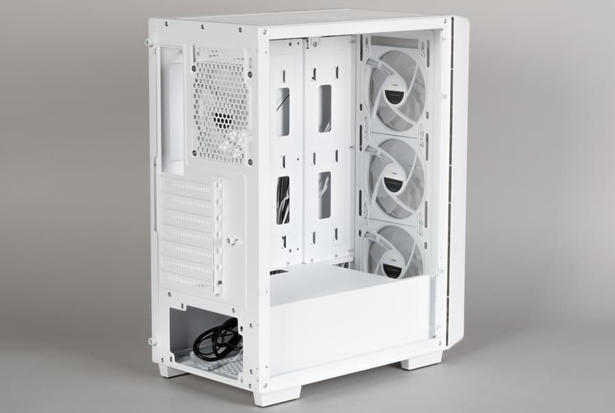 Наличие двух вариантов расцветки (черная и белая) — дело распространенное. Четыре штатных вентилятора с ARGB-подсветкой тоже вполне обычное явление, как и возможность увеличения их количества, а также использования систем жидкостного охлаждения.