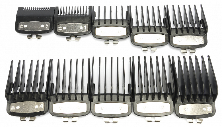 Взглянем на сменные насадки. В комплекте нашлось 10 насадок-гребней, позволяющих установить длину волос на 1,5, 3, 4,5 6, 10, 13, 16, 19, 22 и 25 мм.