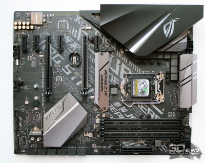 Плата отличается оригинальным расположением портов SATA III — все они размещены горизонтально на краю платы, что делает более удобным подключение и отключение кабелей.