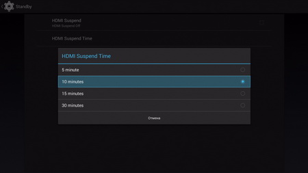 Еще один параметр, отличающий стационарное мультимедийное устройство от мобильного гаджета: автоматическое прерывание видеосигнал при отсутствии активности. Эта функция прячется в разделе Standby, и отвечает за автоматическое выключение плеера при исчезновении HDMI-сигнала. Проще говоря, выключив телевизор, не нужно отключать еще и плеер — он выключится самостоятельно вслед за телевизором спустя означенное количество минут.