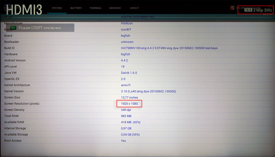 Как и прежде, забавляет алгоритм, по которому выстроено в таких Android-приставках общение между системой и отсутствующим дисплеем. Android подразумевает обязательное наличие сенсорного дисплея в устройствах, но у плееров нет своего экрана. Поэтому здесь разработчик идет на хитрость: система общается с неким виртуальным дисплеем, свойства которого видны в анализирующих программах. Так, в нашем случае якобы существующий у плеера дисплей имеет диагональ 13,77 дюйма и разрешение 1920×1080. Интересно, изменится ли эта информация, если подключить плеер к 4K-телевизору? Проверим теорию, сфотографируем дисплей 4K-телевизора, к которому наш аппарат подключен в режиме 3840×2160 30p: