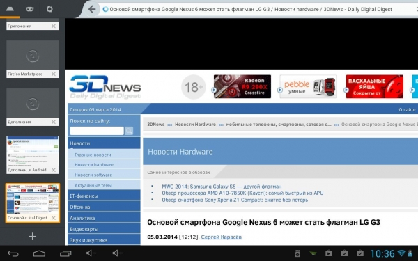 Если интерфейс мобильного Chrome очень напоминает по внешнему виду настольного собрата, то в случае с Firefox все иначе. Разработчики из Mozilla работали, прежде всего, не над тем, чтобы сделать Firefox для Android похожим на настольную версию, а над тем, чтобы сделать его удобным для использования на небольшом экране. Содержимому веб-страницы было решено отвести максимум места, и в результате из интерфейса браузера была изъята даже панель вкладок.