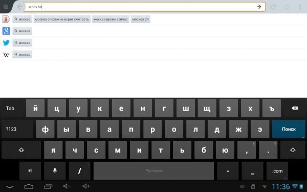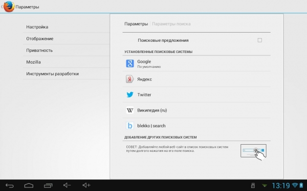 Как уже было сказано выше, адресная строка браузера предназначена для ввода не только URL, но и поисковых запросов. По старой доброй традиции в Firefox по умолчанию используется поисковая система Google. Но мобильная версия браузера имеет гибкие настройки для управления поисковиками. Можно поменять поисковую систему на одну из предустановленных («Яндекс», Twitter, «Википедиа»), а также добавить свою собственную. Механизм добавления максимально прост — достаточно просто зайти на сайт нужного поисковика и удерживать палец на поисковом поле до появления меню.
