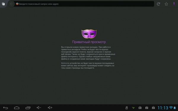 Мобильная версия Firefox поддерживает работу в режиме приватного просмотра. В нем не сохраняется информация о посещенных веб-страницах, файлах cookies, данных форм и поиска, паролях, временных файлах, а также о файлах, которые требуются сайтам для использования в автономном режиме. В режиме приватного просмотра Firefox Mobile меняет цвет адресной строки и прочих элементов интерфейса на черный.