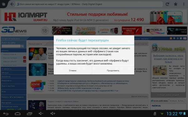 Кроме приватного режима, в Firefox для Android есть еще одна интересная функция, получившая название гостевой сессии. Приватный режим удобно использовать в тех случаях, когда нежелательно, чтобы информация о посещенных веб-страницах и иные данные были переданы на другие синхронизируемые устройства. А гостевые сессии пригодятся тогда, когда нужно на время передать смартфон другому человеку для просмотра пары-тройки сайтов.