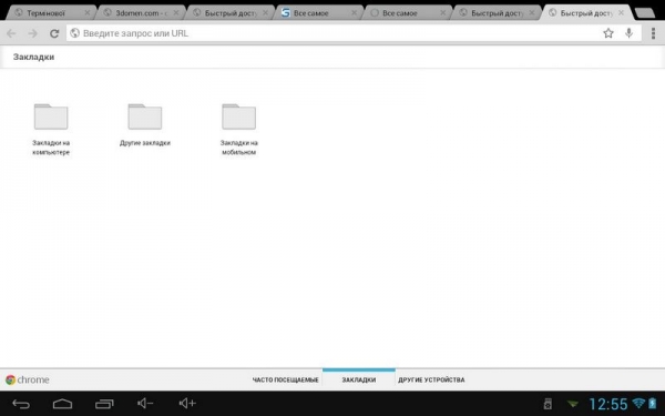 Окно создания новой вкладки содержит три раздела: можно или увидеть свои закладки, или перейти к списку часто посещаемых страниц, или начать с просмотра сайтов, открытых на других устройствах.