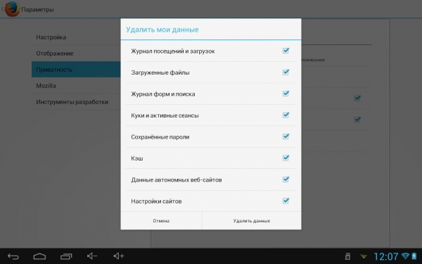 Для обеспечения приватности данных Firefox также предлагает ряд функций, которые можно задействовать в настройках. Так, можно включить запрет на отслеживание (функция, известная как Do Not Track), решить, нужно ли сохранять файлы cookies и пароли. Для управления паролями может использоваться мастер-пароль, который обеспечивает безопасность хранения данных учетных записей в браузере. Также в любой момент можно удалить все сохраненные в браузере данные, в том числе пароли, историю посещенных страниц, файлы cookies и пр.