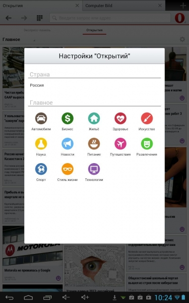 Вторая особенность Opera для Android, унаследованная браузером от старшего брата, — это «Открытия» (известная также как «Рекомендации»). Функция эта чем-то напоминает RSS-клиент: с ее помощью можно читать последние новости с разных сайтов. Однако, по сравнению с RSS-читалкой, у «Открытий» есть одна важная особенность: пользователь никак не может повлиять на выбор источников. Все, что можно сделать, — это выбрать тематику и регион в настройках. Ни удалить сайты, с которых берутся новости, ни добавить свои невозможно.