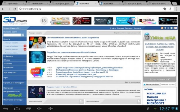А вот адресная строка никуда не делась и, согласно уже устоявшимся в браузерном мире стандартам, объединена с полем для быстрого поиска (в настольной версии, кстати, это еще не сделано). При помощи кнопок, расположенных рядом с адресной строкой, можно выполнять навигацию между страницами, которые были открыты в текущей вкладке, обновлять страницы, добавлять их в закладки. А вот кнопки для создания новой вкладки в основном интерфейсе нет. Для того чтобы создать новую вкладку, нужно щелкнуть по кнопке, показывающей число открытых вкладок, и найти привычный значок крестика в боковом меню. Открытые вкладки отображаются в том же боковом меню в виде эскизов.