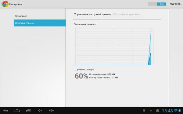 С недавних пор Chrome обзавелся режимом сжатия данных, который работает подобно соответствующей функции Opera: веб-страницы не загружаются сразу, а пересылаются на серверы Google. Там изображения конвертируются в формат WebP и масштабируются до разрешения устройства, а текст — сжимается. После этого страница загружается и отображается в браузере. Режим сжатия данных не работает при включении режима инкогнито, а также в том случае, если данные передаются по протоколу SSL. При включении режима сжатия данных браузер ведет статистику сэкономленного трафика и отображает ее в виде графика.