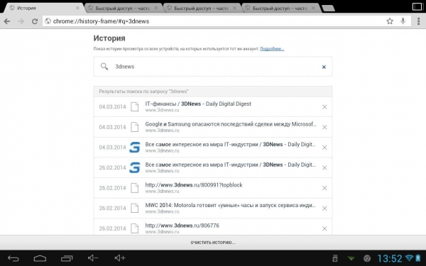 Доступ к истории посещенных страниц возможен через меню браузера. Если синхронизация включена, то на этой странице отображается информация о веб-страницах, которые открывались на всех устройствах, связанных с учетной записью Google. Навигация по ней не самая удобная, но зато есть поиск по ключевому слову. Для очистки истории не нужно блуждать по настройкам — соответствующая кнопка есть прямо на этой странице.