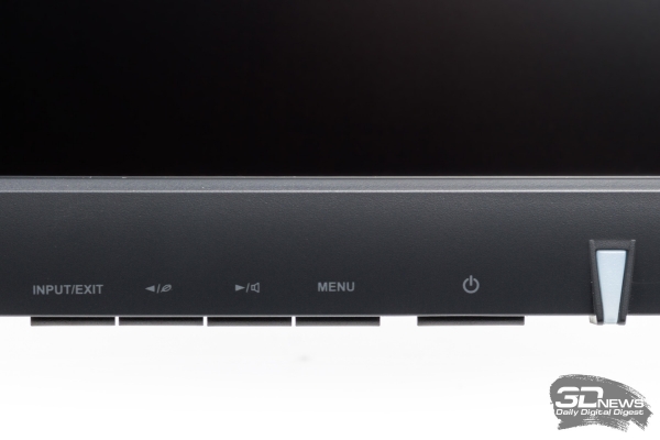 Левая кнопка отвечает за выбор выхода для видеосигнала, следующая за ней клавиша позволяет выбрать одну из предустановок экономичного режима, а правая кнопка дает возможность отрегулировать громкость аудиосигнала. Кроме того, все органы управления, помимо назначенных быстрых функций, отвечают еще и за навигацию по основному окну настроек.