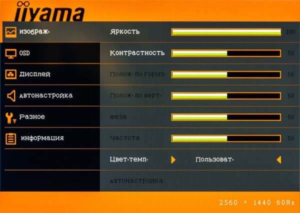 Итак, в пункте «Изображение» можно отрегулировать яркость и контрастность картинки, выбрать одну из предустановок цветовой температуры или настроить ее самостоятельно — при помощи поканальной регулировки базовых цветов. Кроме того, для аналогового подключения становятся доступны такие параметры, как положение по вертикали и горизонтали, а также тонкая настройка фазы и частоты сигнала. Если нет времени или желания делать это вручную, то можно запустить автоматическую регулировку.