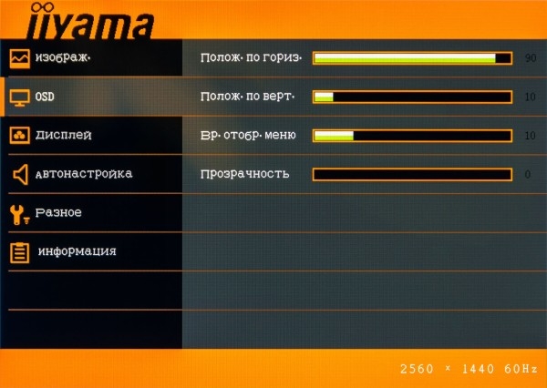 Подменю OSD позволяет задать положение основного окна настроек на экране, а также время отображения меню и прозрачность фона.