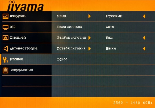 В пункте меню «Разное» пользователю доступны различные сервисные функции, такие как язык интерфейса, выбор входа для видеосигнала, а также настройка приветственного экрана. Кроме того, здесь можно выбрать режим работы монитора при подаче питания и произвести общий сброс регулировок до заводского уровня.