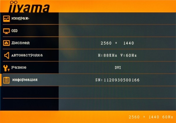 Подменю «Информация» предоставляет сведения о текущих параметрах видеосигнала, выбранном входе, а также данные о серийном номере модели.