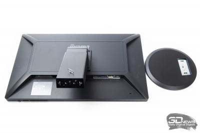 Время отклика матрицы чуть лучше, чем у большинства одноклассников: 5 мс при переключении между градациями серого. Что касается внешних интерфейсов, то здесь есть всё: от устаревшего аналогового D-sub до современного DisplayPort. Блок питания встроенный. Кстати, часто наши читатели в комментариях к статье пишут, что внешний блок питания — это не минус, а плюс. Хотим дать некоторые пояснения, почему мы думаем иначе. Когда монитор стоит на столе, то по большому счету не имеет значения, какой у него блок питания. Однако многие пользователи предпочитают настенное размещение, которое позволяет более эффективно использовать рабочее пространство. И вот здесь удобнее использовать дисплей со встроенным источником вторичного напряжения, поскольку в этом случае к розетке идет нормальный силовой кабель, а не увесистая коробочка на тонком проводке. Кстати, о настенном размещении: разработчики предусмотрели посадочное место для стандартного кронштейна VESA размером 100×100 мм. Правда, будет необходимо воспользоваться отверткой, чтобы демонтировать опору.