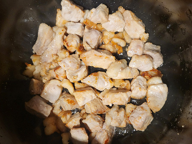 Вначале мы отрезали у свинины жир и отправили в мультиварку на всё ту же программу «Жарка» обжариваться. В этот раз мы дали возможность программе выйти на рабочие параметры, и надо сказать, что она это сделала достаточно быстро, в отличие от предыдущего опыта.
