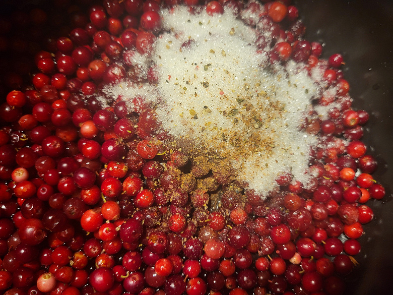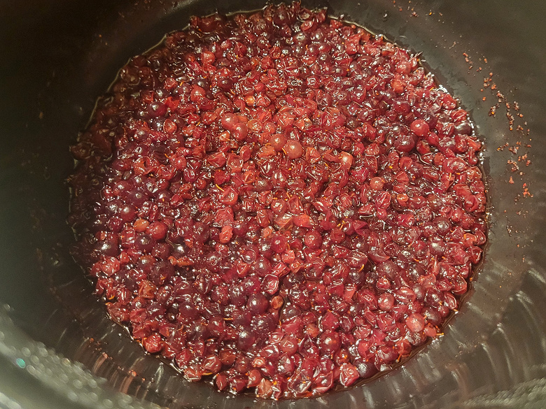Следующая нестандартная программа, которую мы решили попробовать — это программа «Соус». Взяли примерно полкило брусники, добавили немного сахара, перца и мускатного ореха, граммов 50 красного сухого вина (тоже осталось с вечеринки) и отправили в мультиварку.