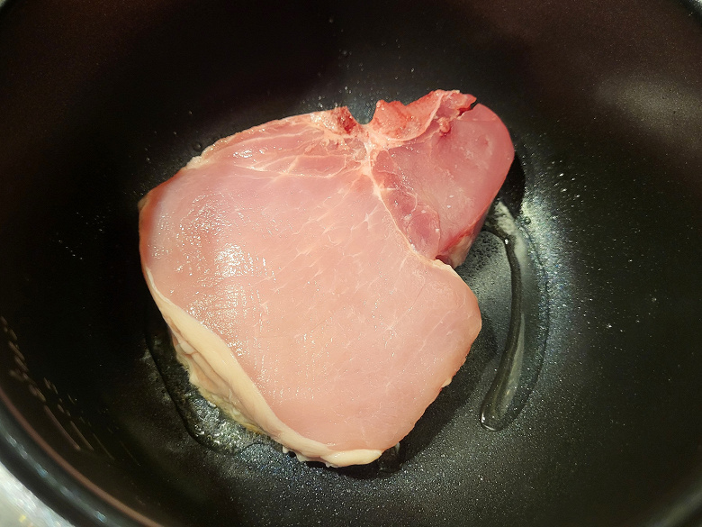 Начали мы с самого простого теста: решили пожарить свинину. Дело в том, что когда жаришь свинину на сковородке, плита и стол вокруг оказываются забрызганы жиром. Здесь, за счет высоких стенок чаши мультиварки, этого не произошло.