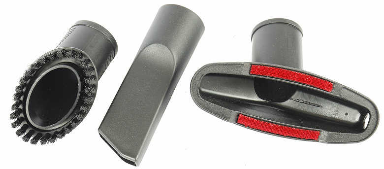 Диаметр трубки на конце шланга рассчитан на подключение к электроинструменту. Кроме основной насадки в комплект входят аксессуары для уборки воды с резиновым уплотнителем для ее сбора и три стандартные насадки для мебели, аппаратуры, щелей.