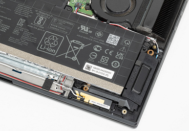Стереодинамики находятся на боковых скосах корпуса, ближе к передней кромке. Вероятно, подразумевается отражение звука от поверхности, на которой установлен ноутбук.