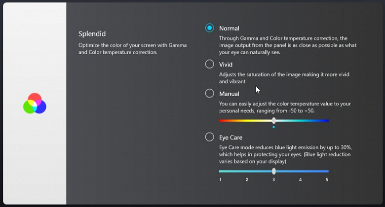 На соответствующей закладке MyAsus можно изменить ряд настроек экрана: выбрать профиль цветокоррекции и вручную подстроить цветовой баланс. Также есть специальный профиль (Eye Care) для снижения интенсивности синей компоненты (впрочем, в Windows 10 есть функция, работающая аналогично). В принципе, яркий свет может приводить к нарушению суточного (циркадного) ритма (см. статью про iPad Pro с дисплеем 9,7 дюйма), но все решается снижением яркости до низкого, но еще комфортного уровня, а искажать цветовой баланс, уменьшая вклад синего, нет абсолютно никакого смысла.