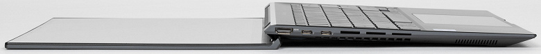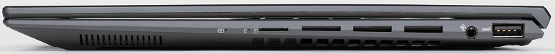 Справа — порт USB 3.2 Gen 2 Type-А, комбинированный разъем для аудиогарнитуры, прорезь картовода microSD, а также два крошечных индикатора: дальний от передней кромки показывает дисковую активность, а ближний цветом (белый/красный) и режимом (выключен/горит) свидетельствует о состоянии батареи, в том числе при подключении адаптера к выключенному ноутбуку.