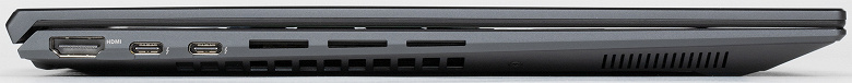 На левом боку ноутбука расположены разъемы HDMI и пара Thunderbolt 4 USB-C (любой из этих двух может использоваться для подключения адаптера питания).