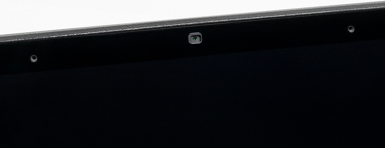 Рамка вокруг экрана действительно очень тонкая, но это если говорить об элементах, выступающих за пределы наружного стекла. А воспринимаемые глазом при включенном ноутбуке темные полосы по краям имеют вполне заметную (хотя и сравнительно небольшую) ширину: по бокам 4,5 мм, вверху 8 мм — там расположены веб-камера (с индикатором, но без шторки) и отверстия для микрофонов, внизу 19 мм до изгиба крышки; производитель утверждает, что экран занимает 92% поверхности, и это вполне похоже на правду.