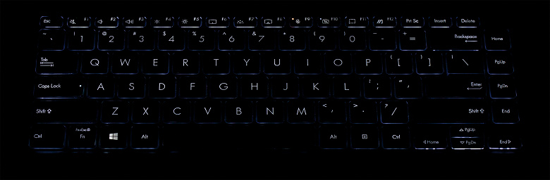 Предусмотрена подсветка с тремя уровнями яркости (четвертое состояние — выключена), но даже максимальный чрезмерно ярким не назовешь; подсвечиваются и символы на клавишах, и боковины. При любом варианте питания, от батареи или от адаптера, подсветка автоматически отключается через минуту, но вновь включается при нажатии любой клавиши или касании тачпада.