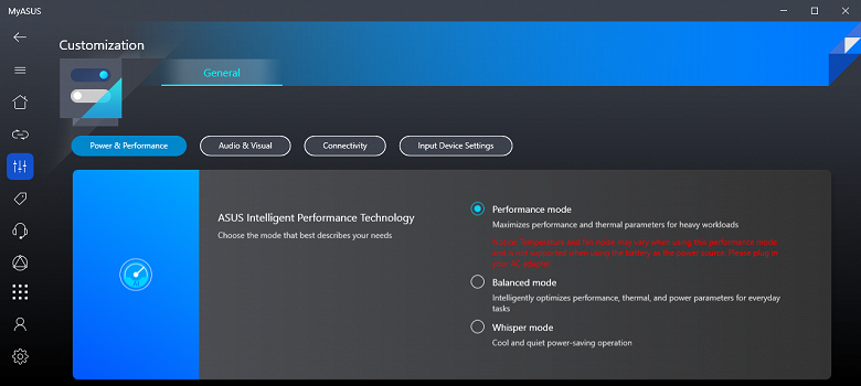 Есть три установки для баланса между производительностью и энергопотреблением (а соответственно нагревом и шумом от вентиляторов), причем максимум возможен только при питании от сети через адаптер.