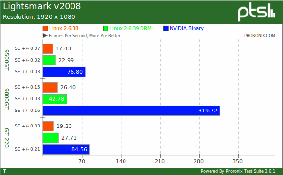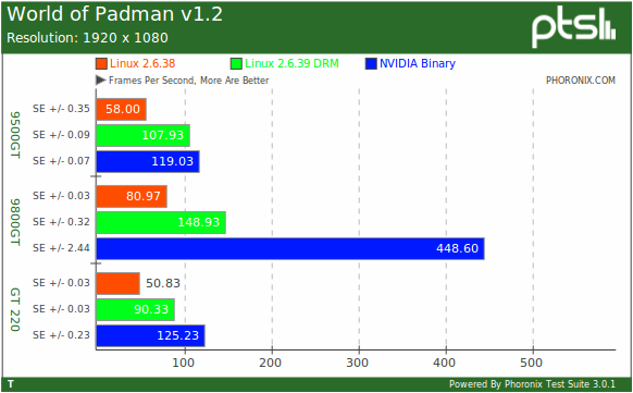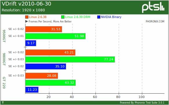 Ресурс Phoronix провел тестирование производительности проприетарного драйвера NVIDIA и свободного видеодрайвера Nouveau c DRM-модулями из Linux-ядер 2.6.38 и 2.6.39-pre-rc. Тестирование было проведено для четырех карт: GeForce 8500GT 512MB, GeForce 9500GT 1024MB, GeForce 9800GT 512MB и GeForce GT 220 1024MB.По сравнению с прошлыми версиями разрыв производительности Nouveau и проприетарного драйвера кардинально уменьшился, за исключением ситуации при использовании карты GeForce 9800GT, производительность проприетарного драйвера при использовании которой на голову опережает Nouveau в большинстве тестов. В тесте VDrift привычный порядок расстановки сил был нарушен и Nouveau заметно обогнал драйвер NVIDIA. Значительный скачок производительности Nouveau связан прежде всего с реализацией поддержки Page Flipping и Z-сжатия в DRM-модуле Nouveau, а также с проведением дополнительных оптимизаций OpenGL.