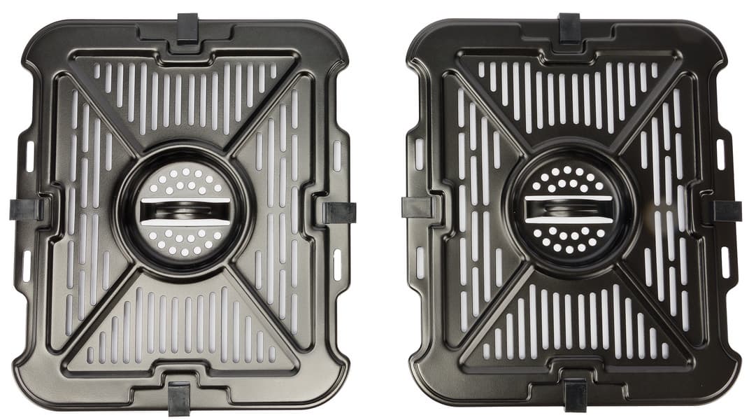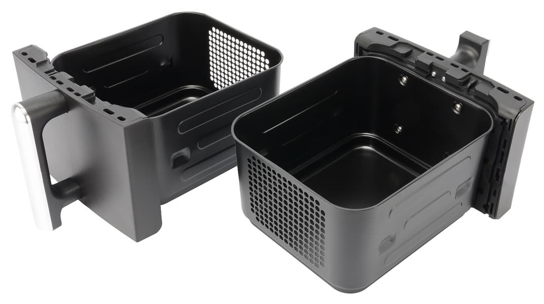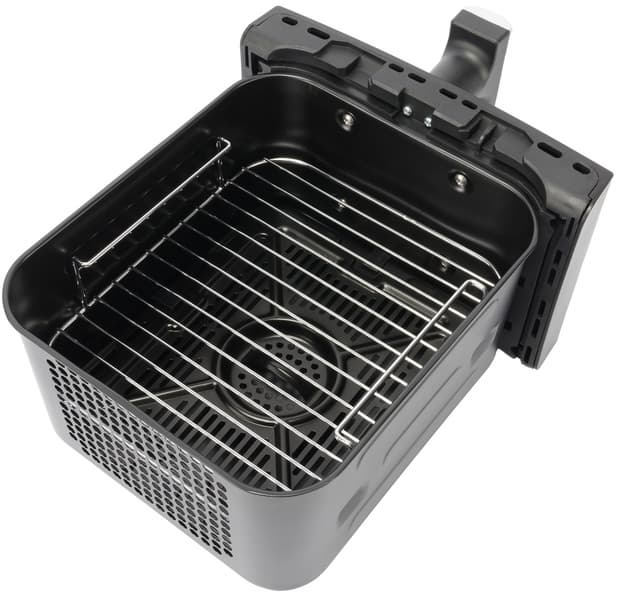 Внутри корзин находятся специальные решетки — они позволяют маслу и жиру стекать вниз, а горячему воздуху циркулировать равномерно. Решетки также снабжены антипригарным покрытием.