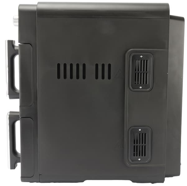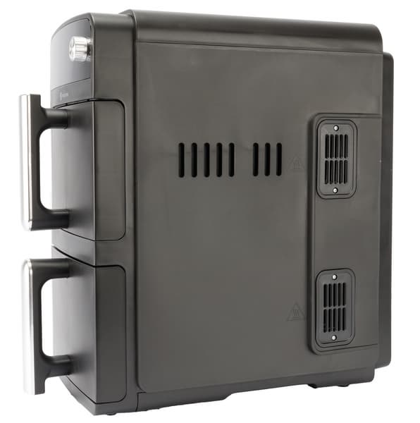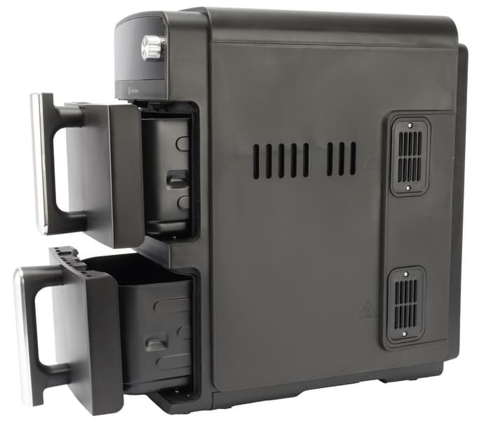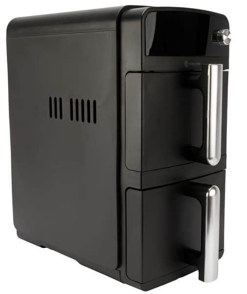 Evolution Airo 10700 Dual — аэрофритюрница вместительная, но при этом компактная благодаря вертикальной компоновке. Главная особенность модели — две независимые корзины общим объемом 10 литров (по 5 литров каждая) с собственными нагревательными элементами и вентиляторами. Это позволяет одновременно готовить два разных блюда или большие порции одного продукта, без проблем обеспечивая семью ужином.