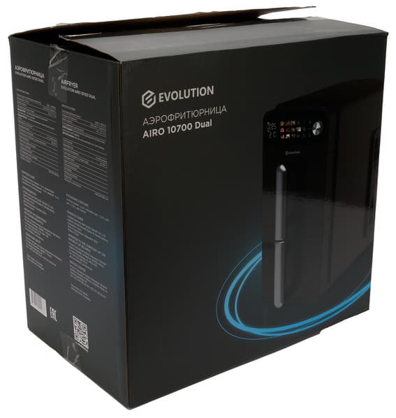 Картонная коробка аэрофритюрницы Evolution Airo 10700 Dual выполнена в фирменном стиле и содержит фото прибора с подробным описанием его функций.