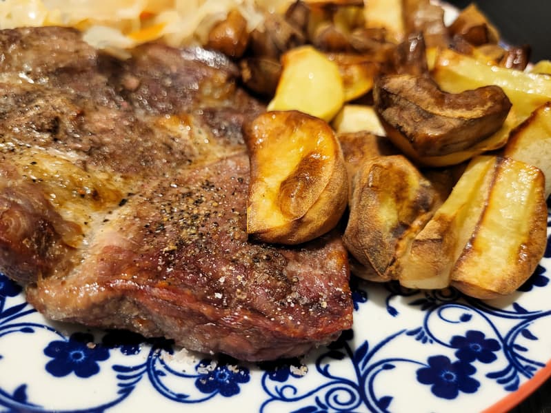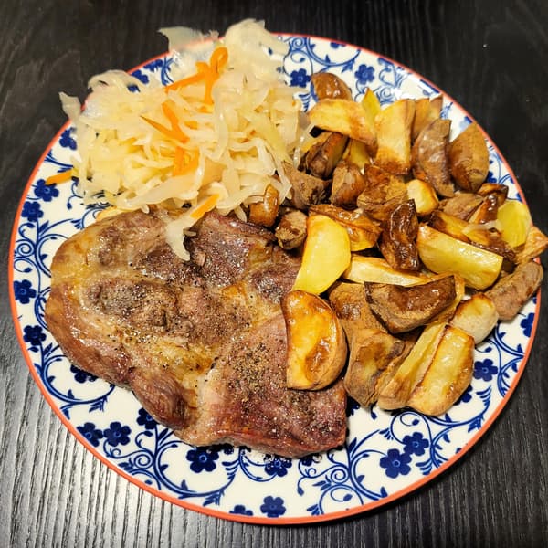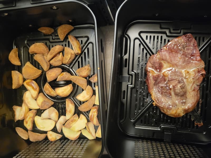 Для картошки поставили автоматическую программу «Картофель-фри» (25 минут), а для свинины — автоматическую программу «Стейк» (13 минут). Чтобы оба блюда приготовились одновременно, мы включили функцию Sync.