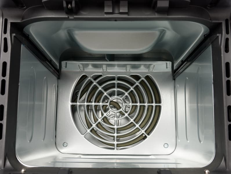 Нагревательный элемент закрыт защитной решеткой, которая предотвращает попадание на него крупных частиц продуктов.